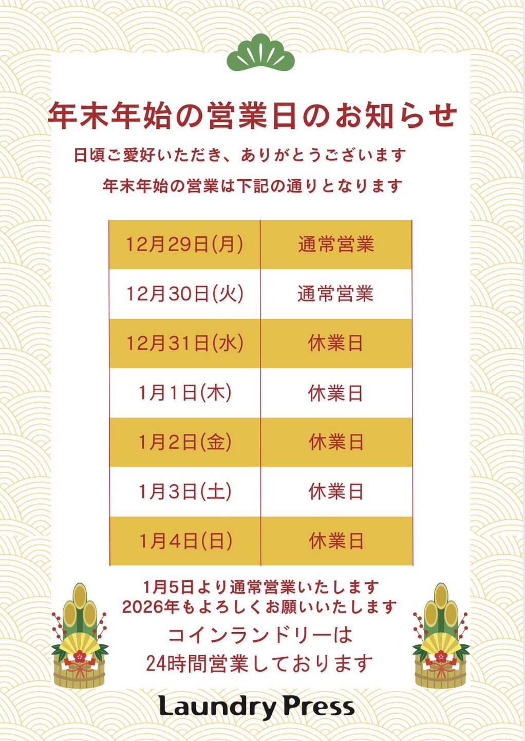 なお、コインランドリーは年末年始も24時間営業しておりますので、
