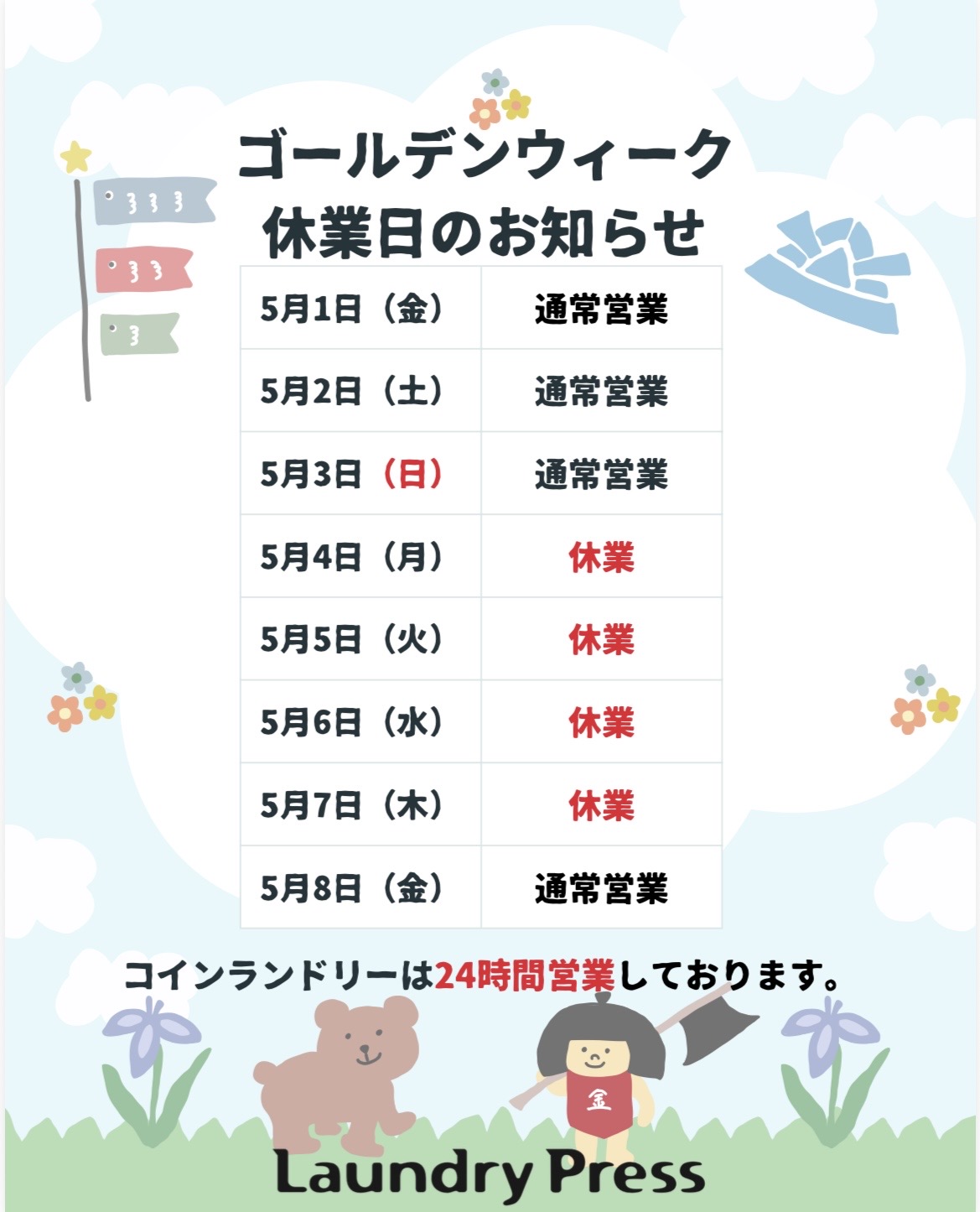 なお、コインランドリーは期間中も24時間通常営業しておりますので、いつでもご利用いただけます✨